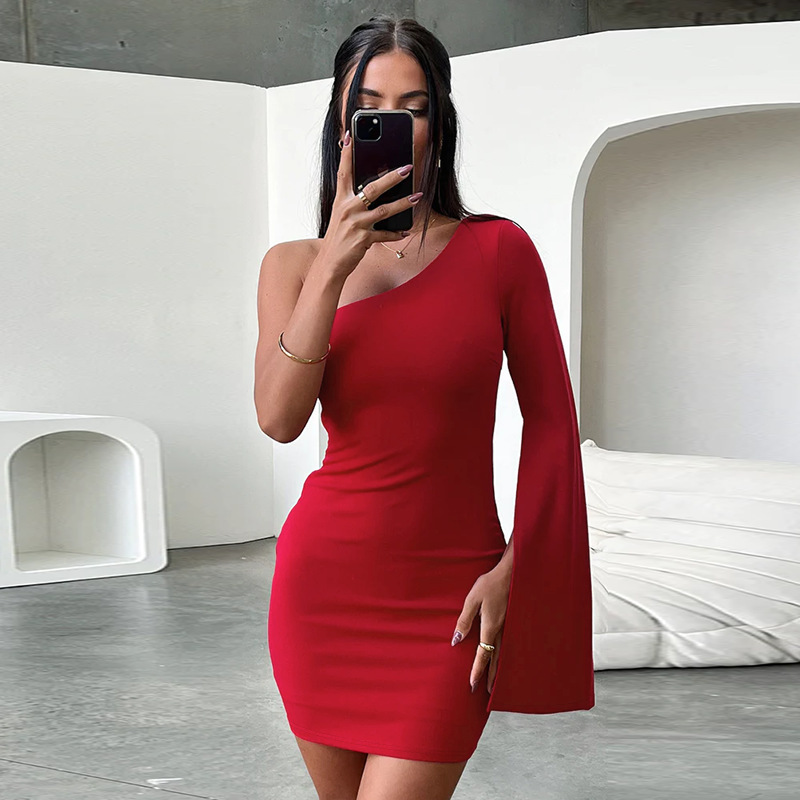 Women's Fashion Unilateral Split Sleeve Sloping Shoulder Dress